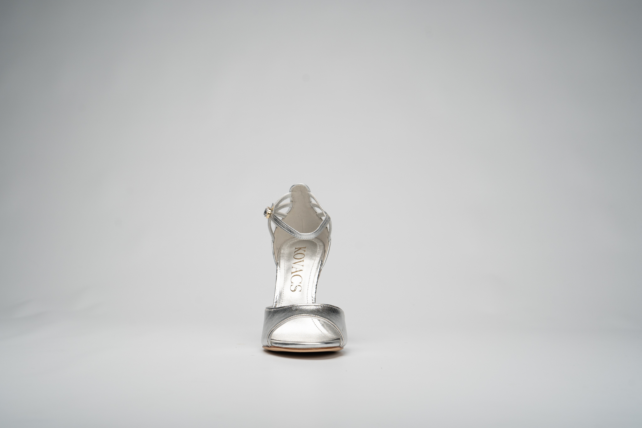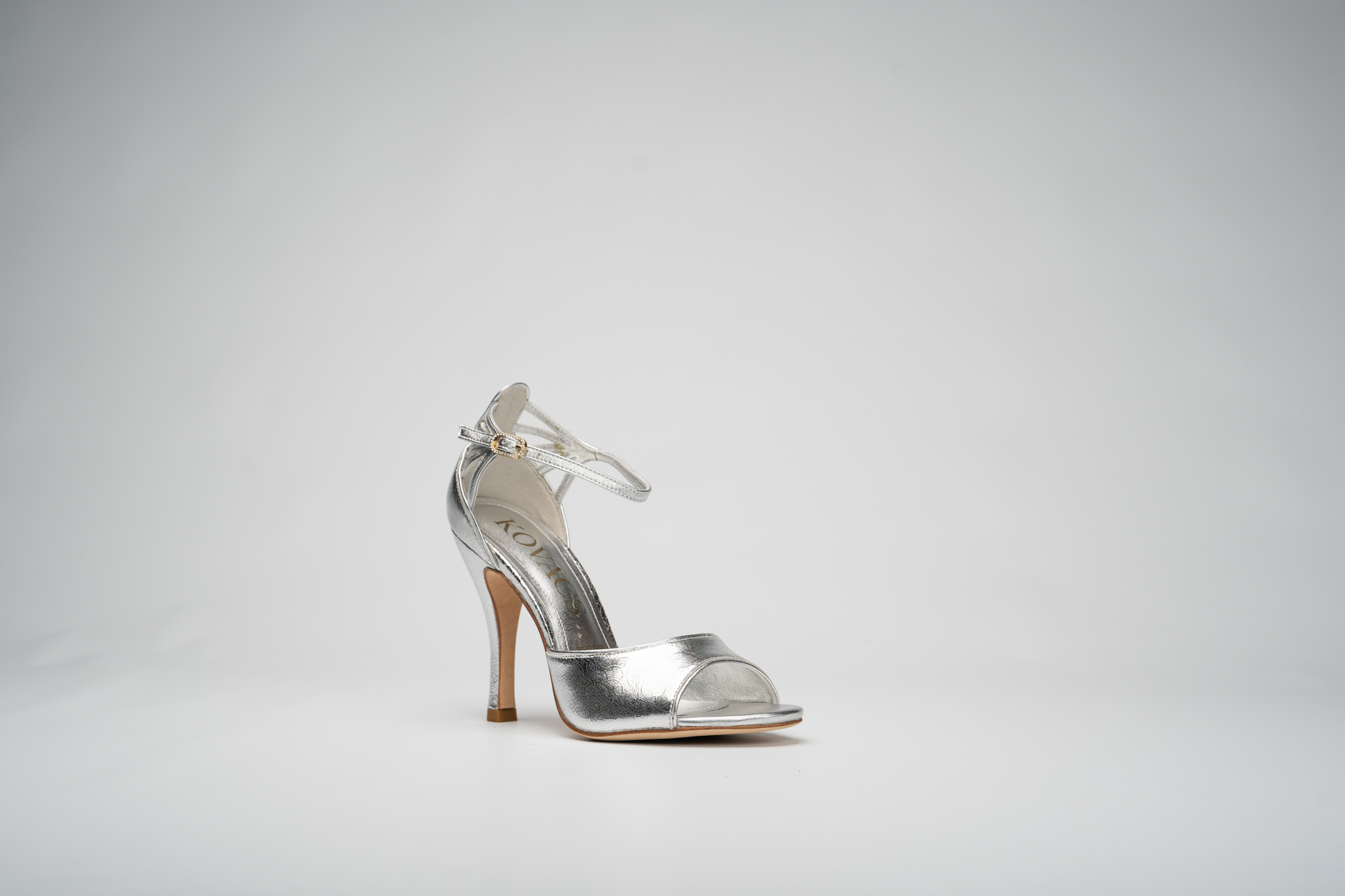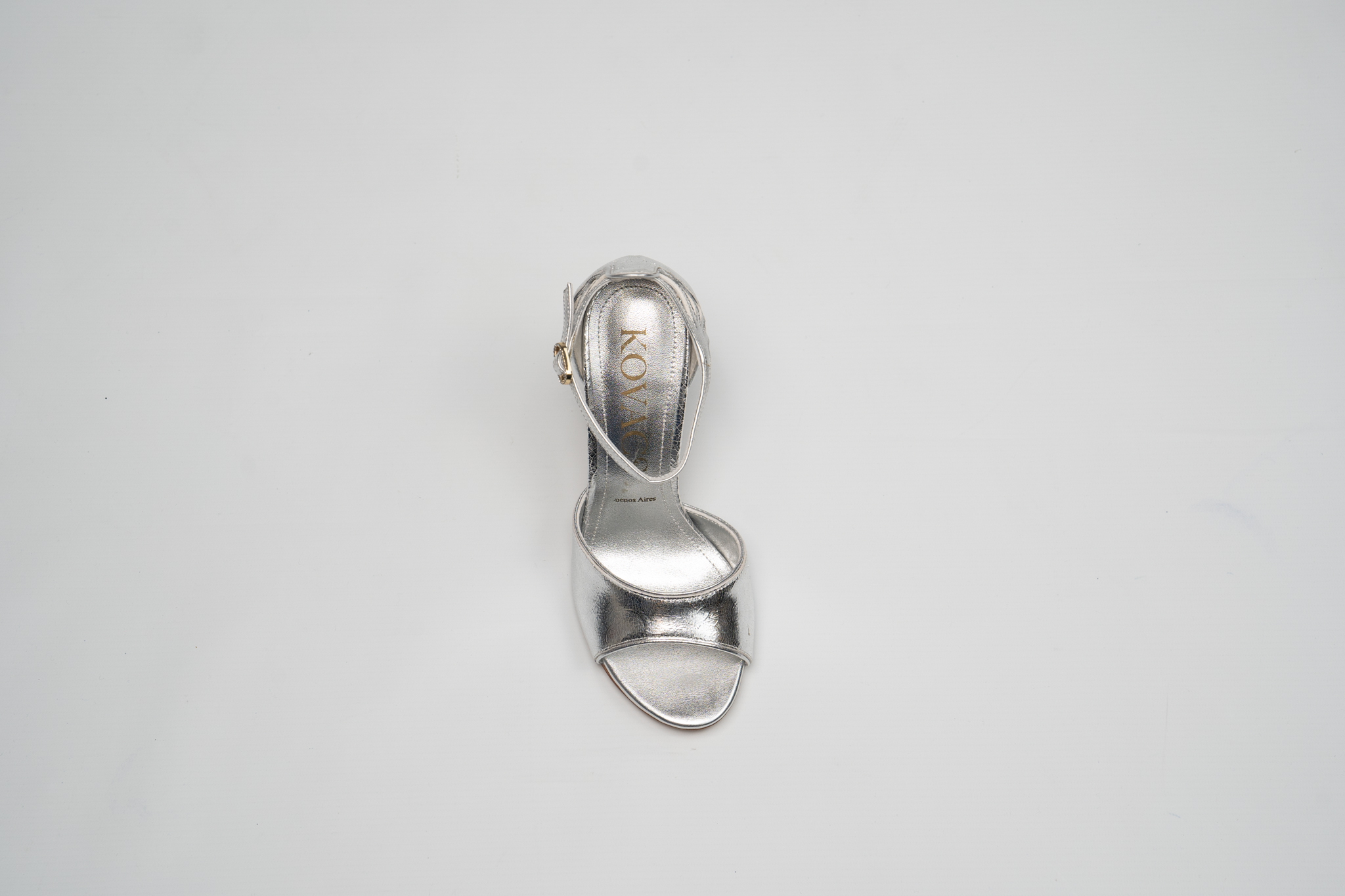 Plantilla de calcetÃn en piel plateada con la marca KOVACS en dorado
