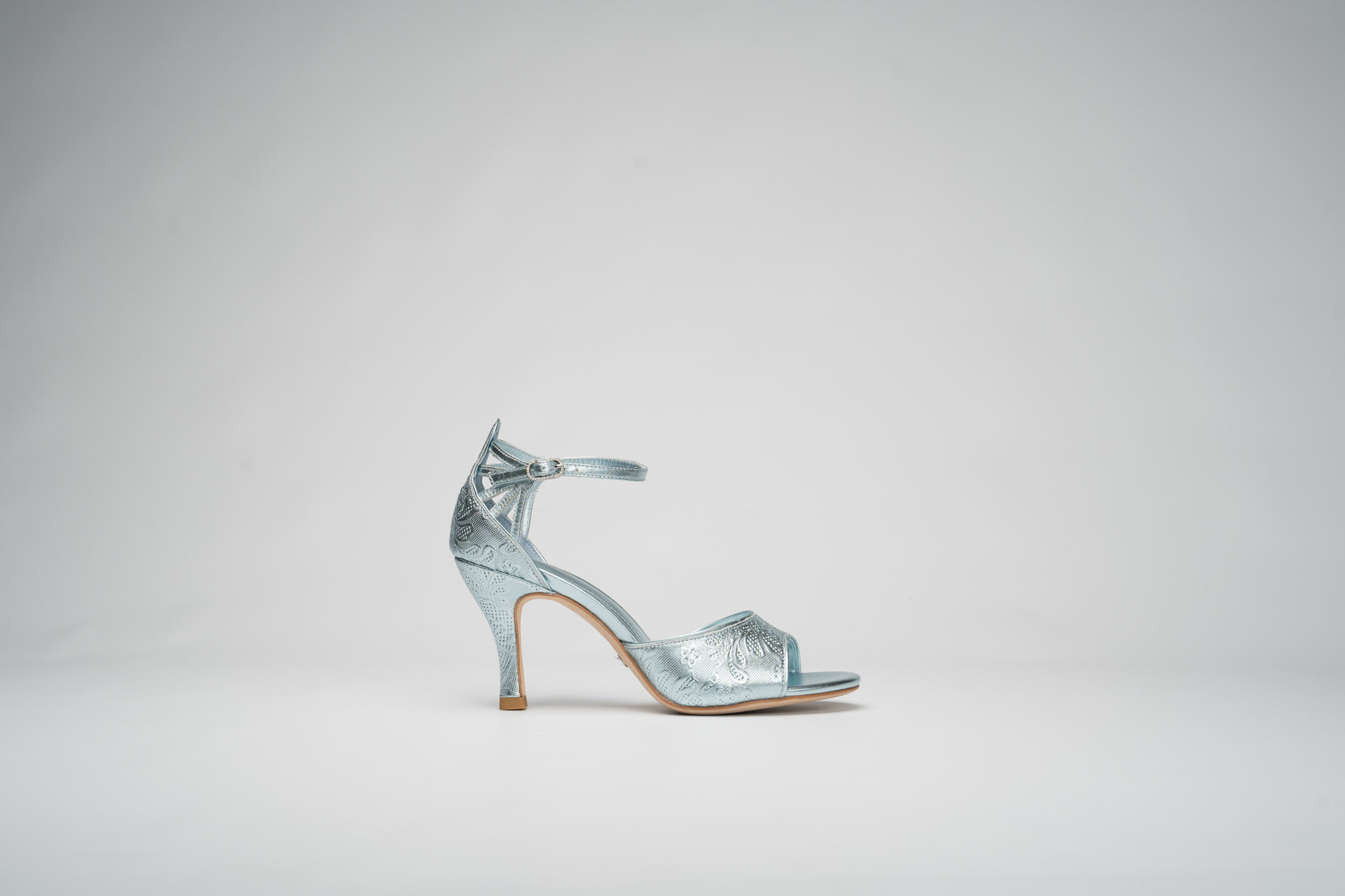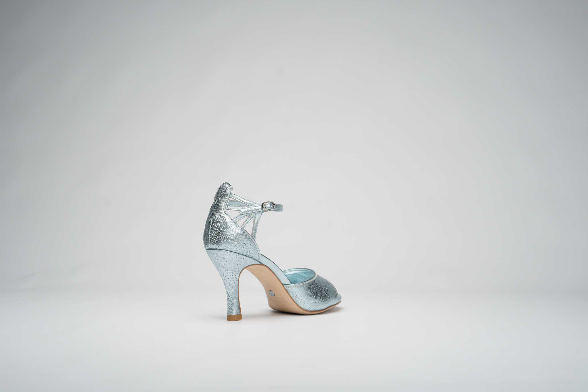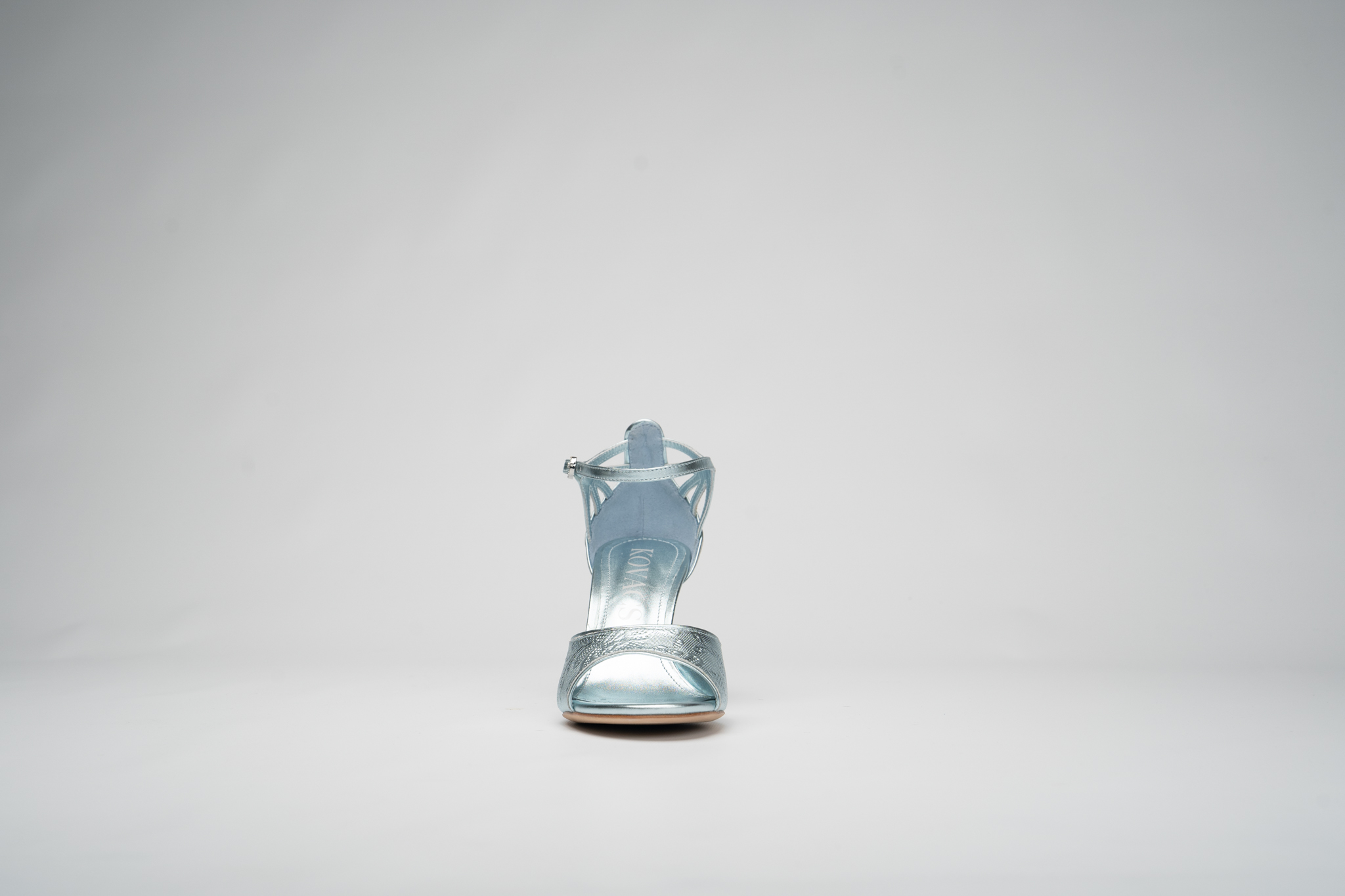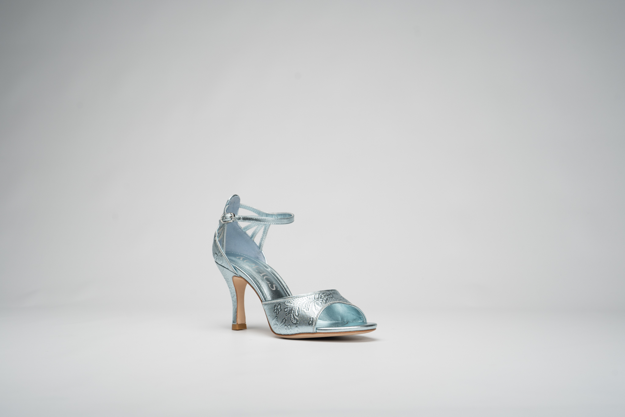 Plantilla con tacón forrada con piel brillante grabada en azul celeste