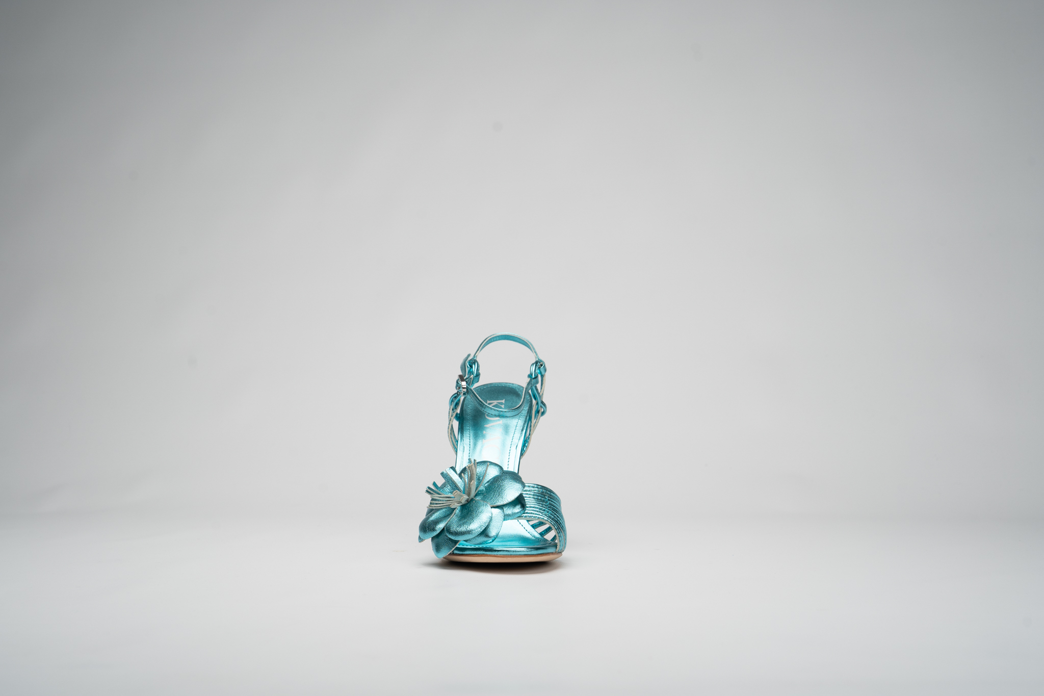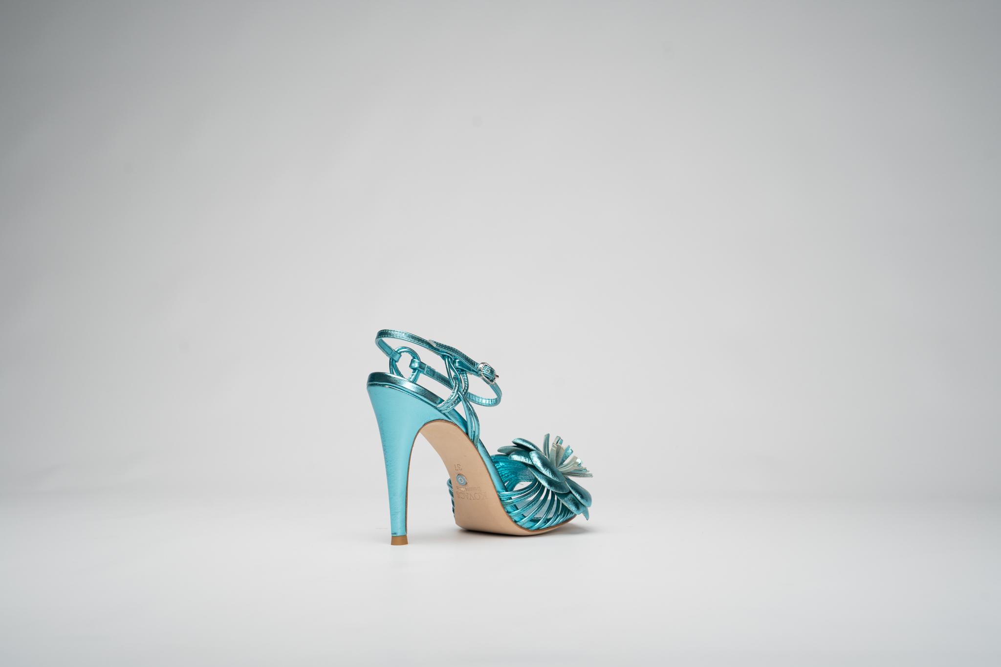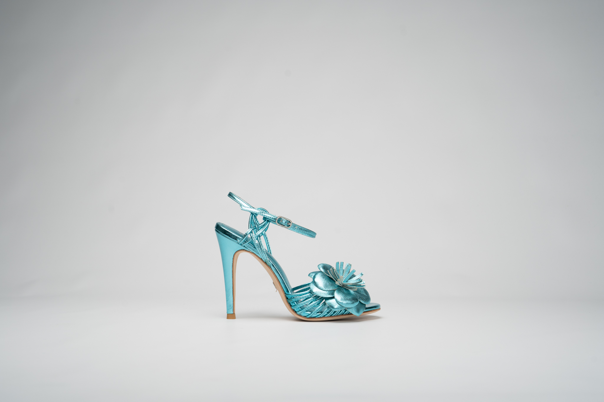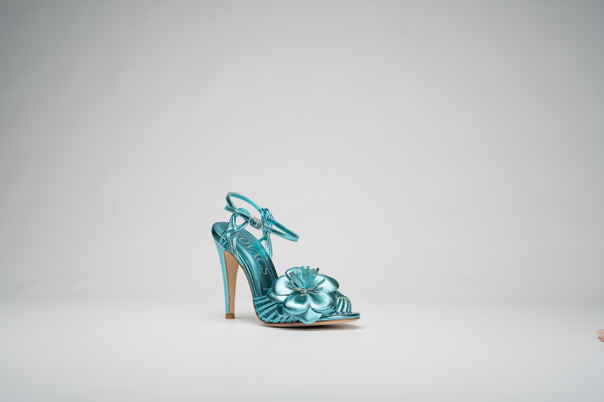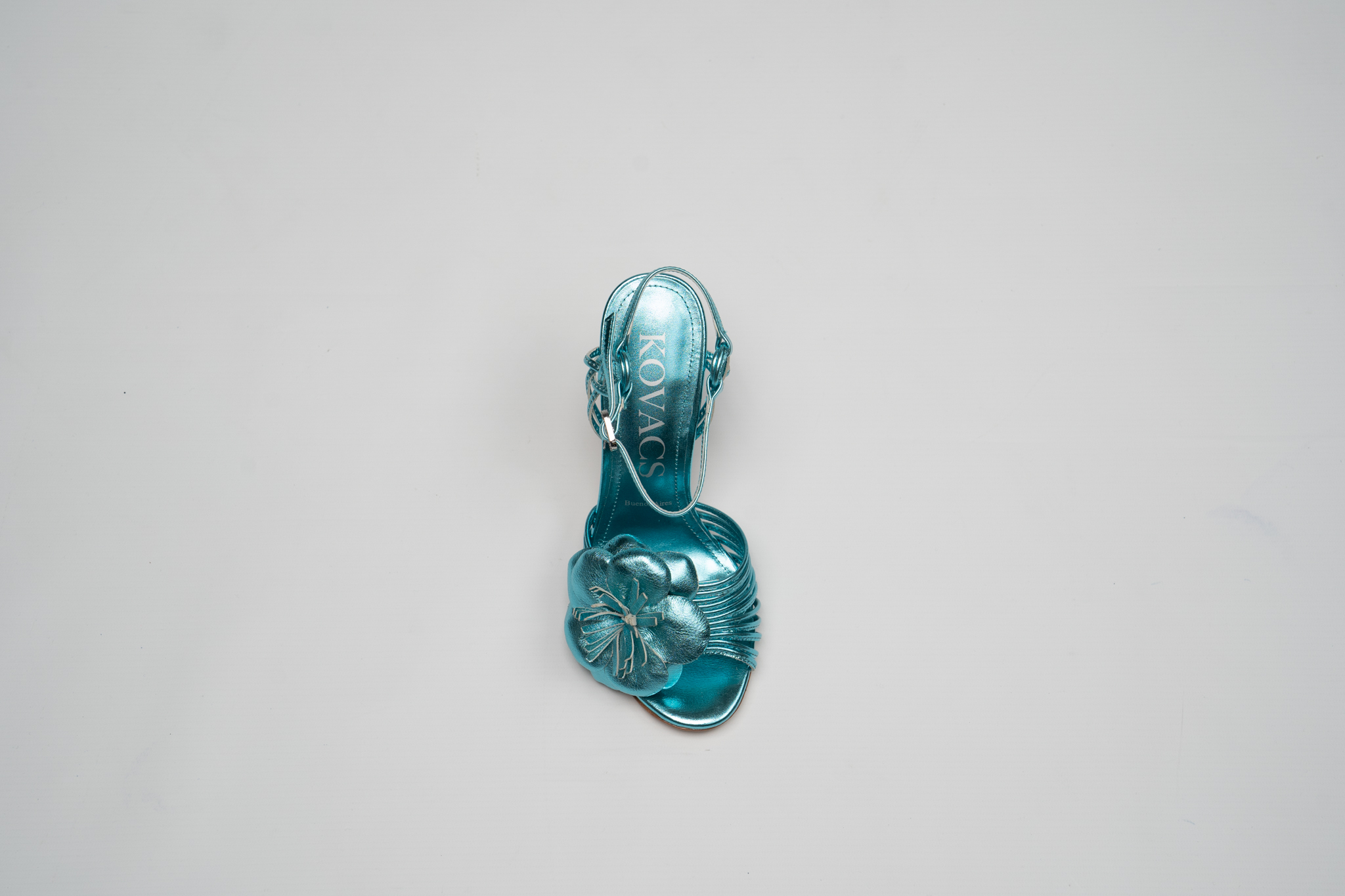 Plantilla de calcetÃn en piel azul claro brillante con la marca KOVACS en plata