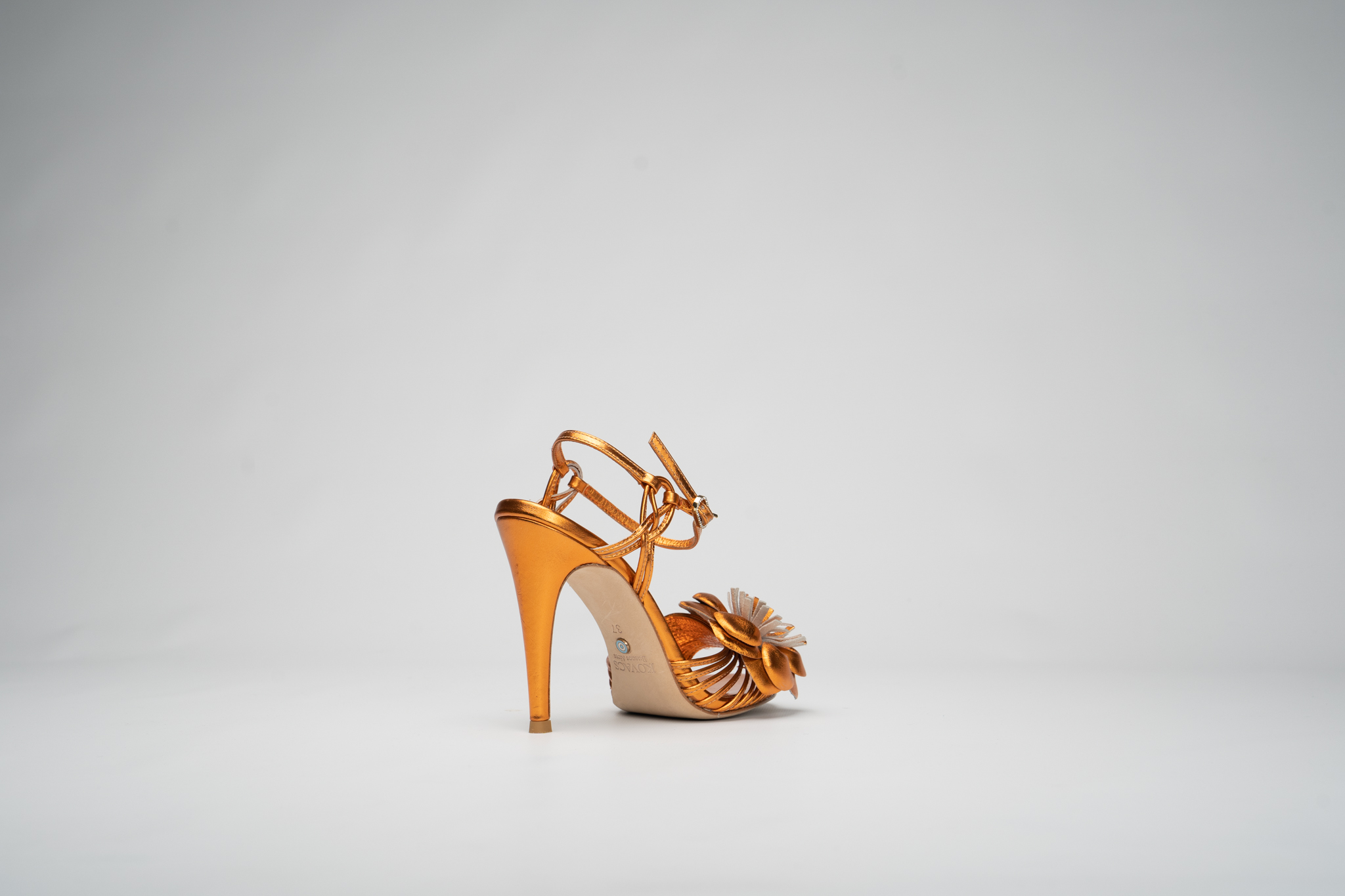 Plantilla de calcetÃn en piel naranja con el logotipo de KOVACS en plata.